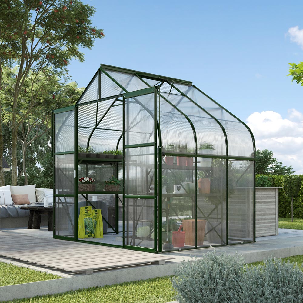 Vitavia Diana 5000 är den minsta modellen i Diana-serien, men tack vare sin böjda taklinje och generösa fönster känns den förvånansvärt rymlig. Inom de 5m² golvyta går det att utnyttja utrymmet smart: längs väggarna kan odlingslådor placeras, samtidigt som det i mitten fortfarande finns plats för ett kompakt odlingsbord eller en liten sittplats. På så vis skapas en ljus, skyddad plats där odling och avkoppling enkelt går hand i hand.