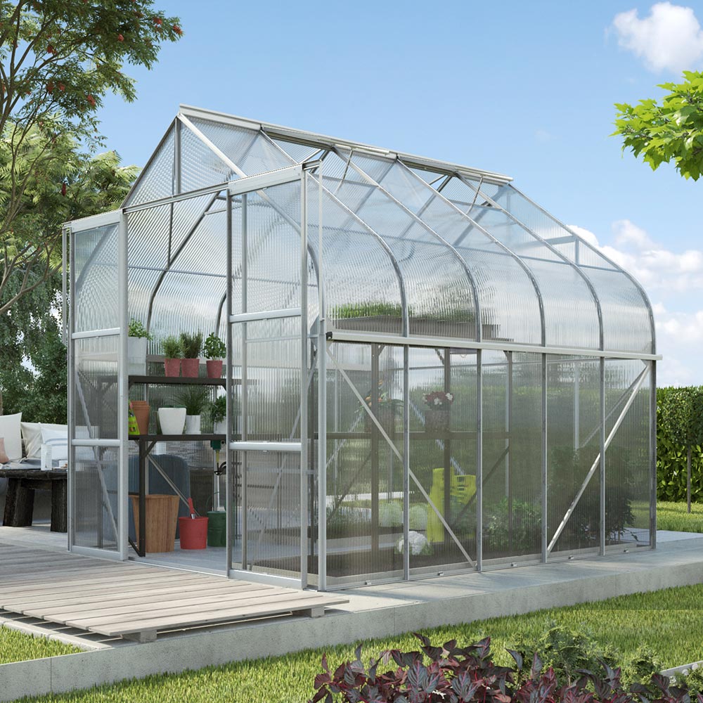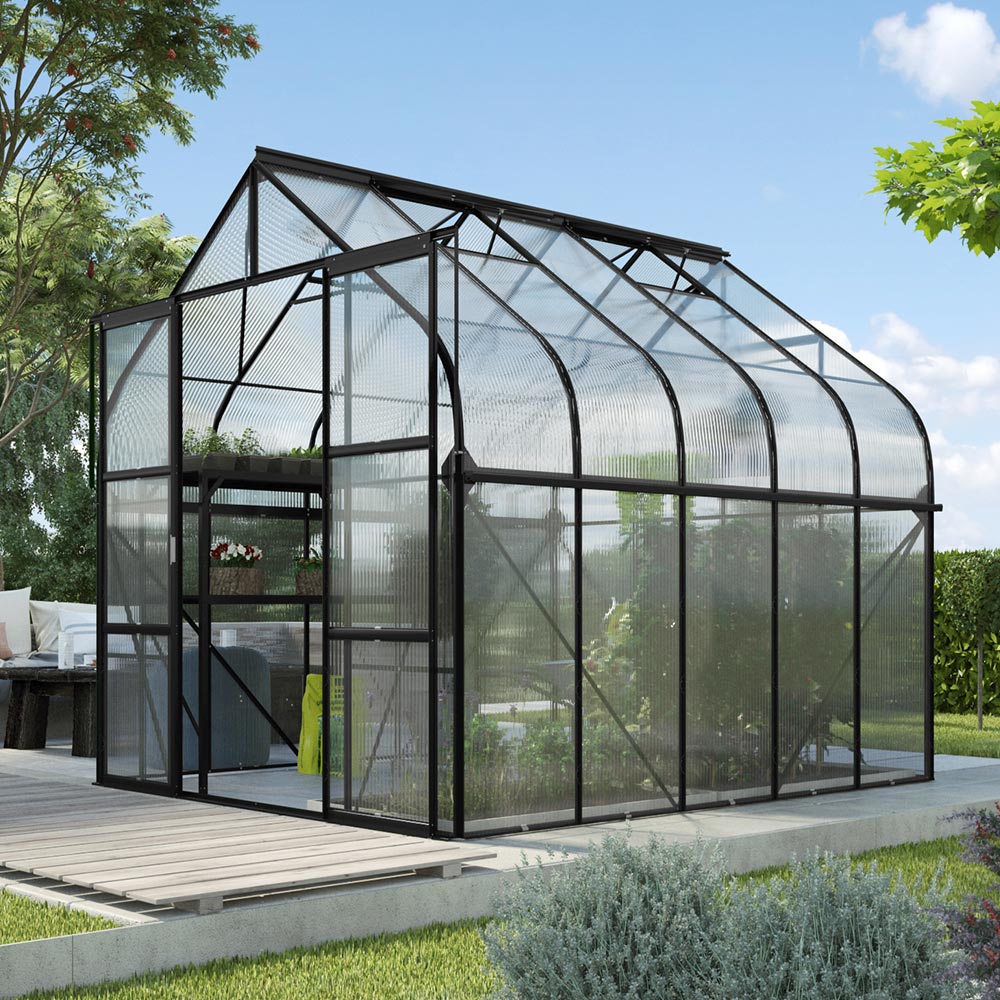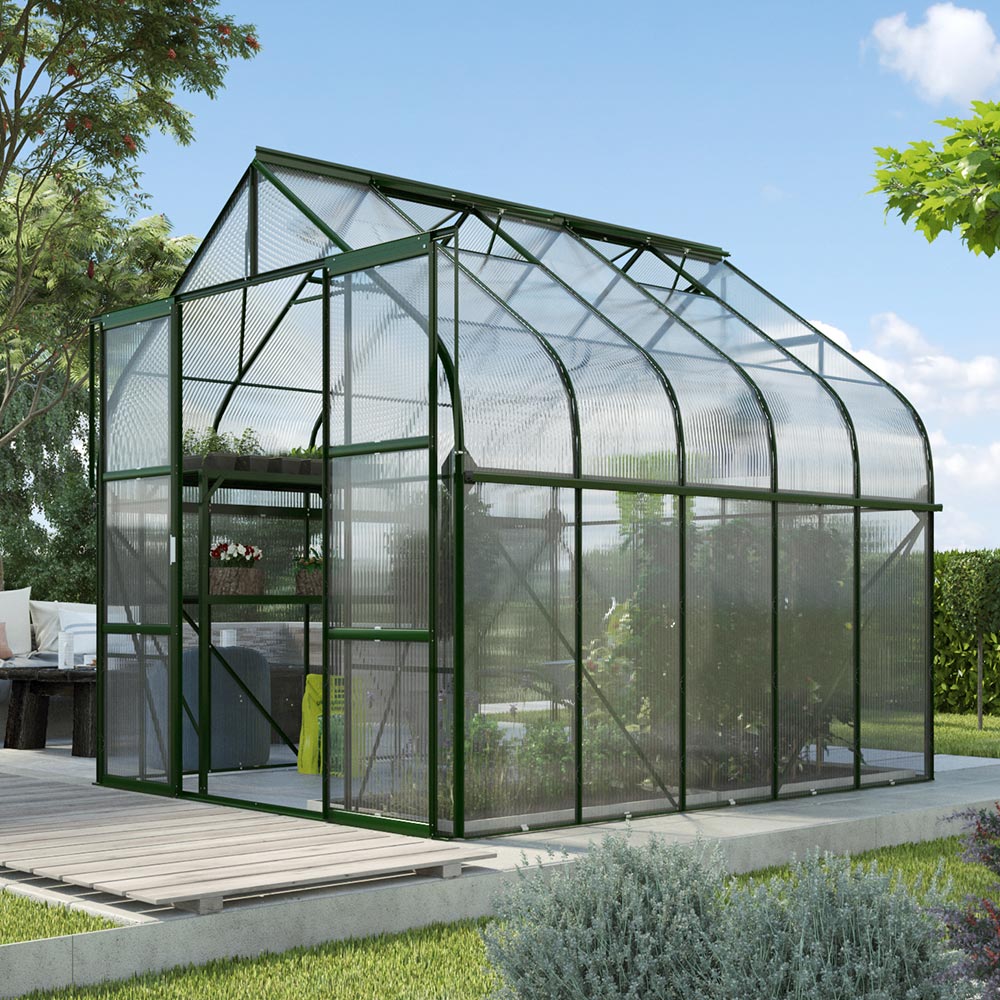 Vitavia Diana 8300 utstrålar klassisk elegans tack vare sin böjda taklinje och generösa väggar. På den 8,3m² stora golvytan finns det gott om plats för en liten sittgrupp, samtidigt som det finns gott om utrymme kvar för att odla växter eller ta hand om unga plantor. De böjda panelerna ger ett sirligt, tidlöst utseende och ett naturligt ljusinsläpp som ger växthuset en varm och inbjudande känsla.