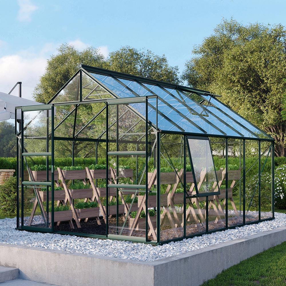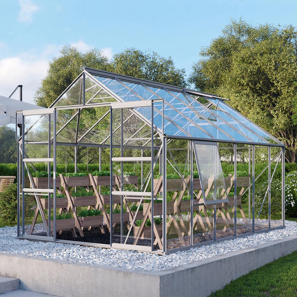 Vitavia Meridian 2 9900 erbjuder generöst med utrymme för dig som gärna tänker större i trädgården. Med en golvyta på 9,9m² och raka väggar skapas en bekväm arbetsmiljö där du utan problem får plats med flera odlingsbord, höga krukväxter eller breda odlingsbäddar. De dubbla skjutdörrarna ger en bred ingång till växthuset, så att du enkelt kliver in och har gott om rörelseutrymme under arbetet.