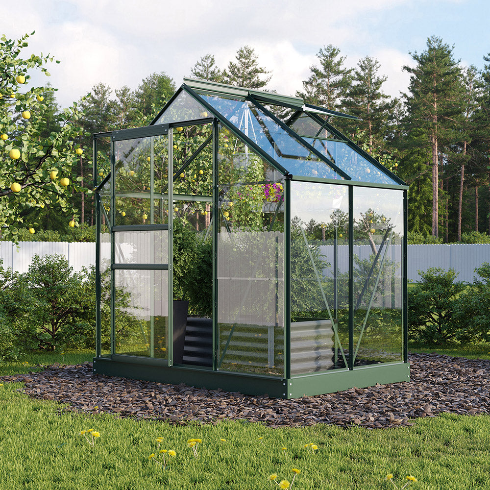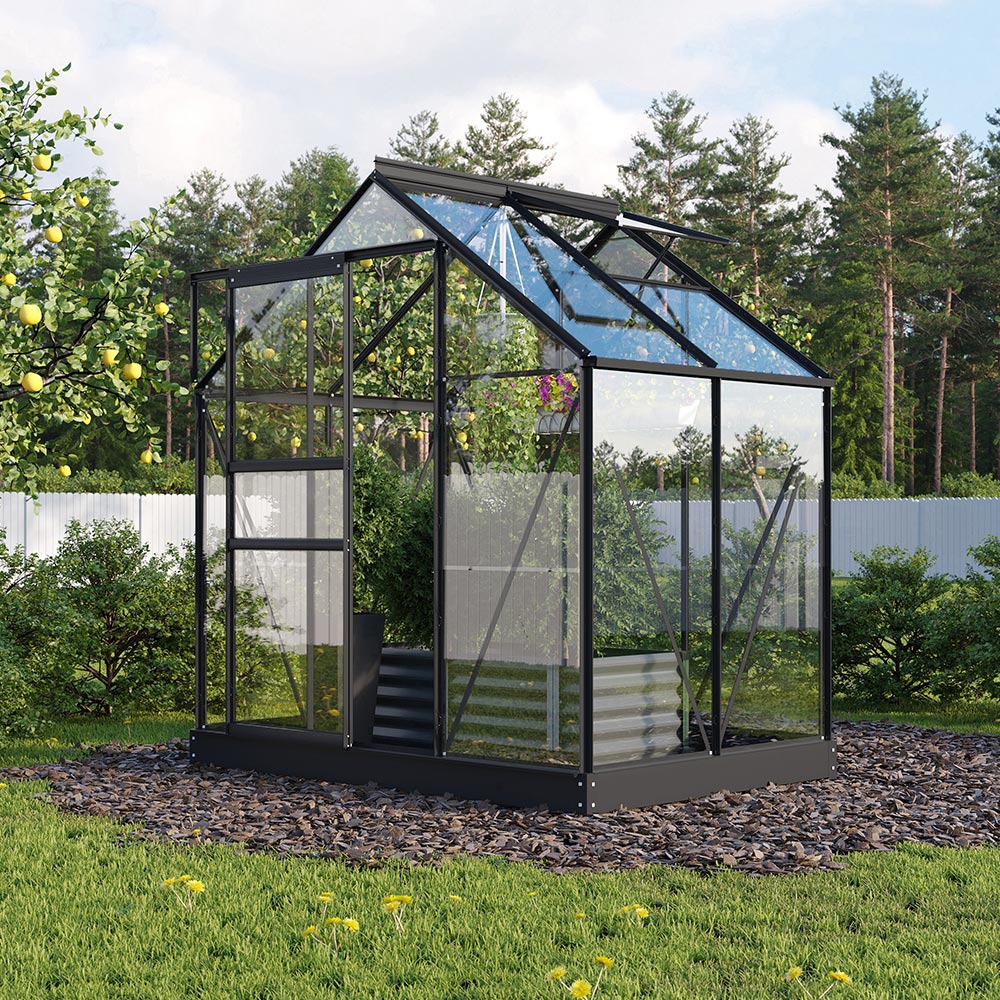 Aluminiumkonstruktionen är stilren, underhållssnål och robust utförd. Glasningen finns i två varianter: helt i 6 mm kanalplast för god isolering eller klart säkerhetsglas för maximal ljusinsläpp. Panelerna är monterade enligt klämfjädersystemet: varje glas- eller skivdel pressas mot ramen och kläms fast med fjädrar mellan profil och list. Det ger en stabil montering, god vindbeständighet och gör det enkelt att byta ut en enskild panel. Den enkla skjutdörren ger smidig åtkomst och takfönstret ger naturlig ventilation, vilket gör att växthuset känns bekvämt även under kallare dagar eller vid övervintring av krukor.